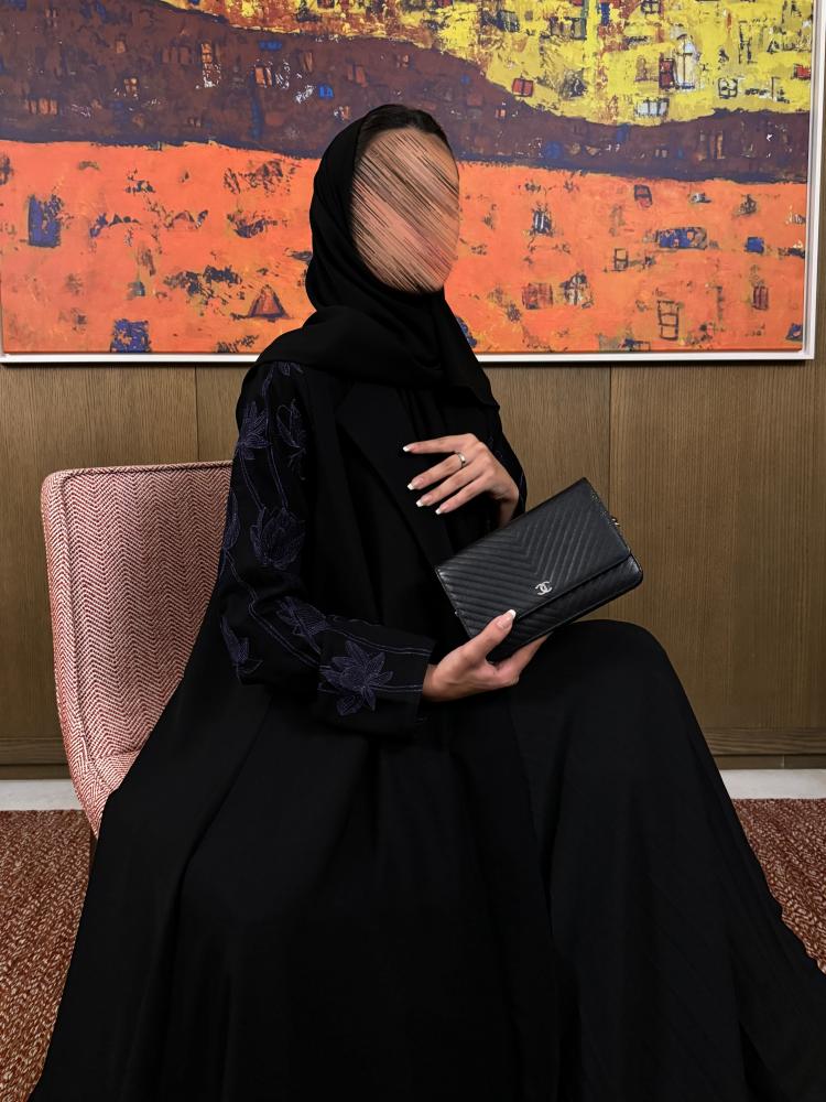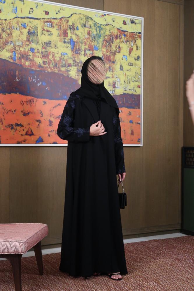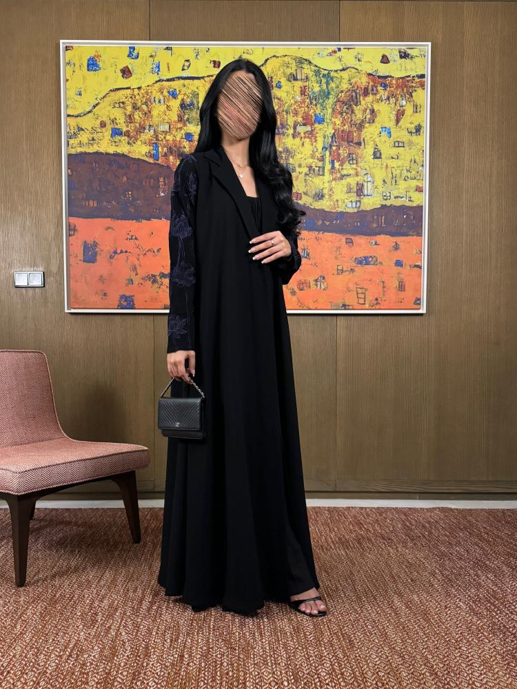 عباية كريب كوري اسود خفيف طايح نص كلوش مع تدخلية كريب بتطريز قصب