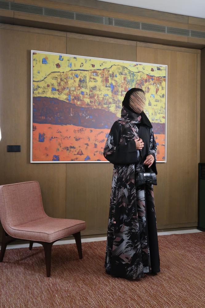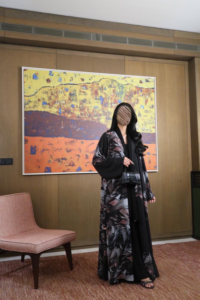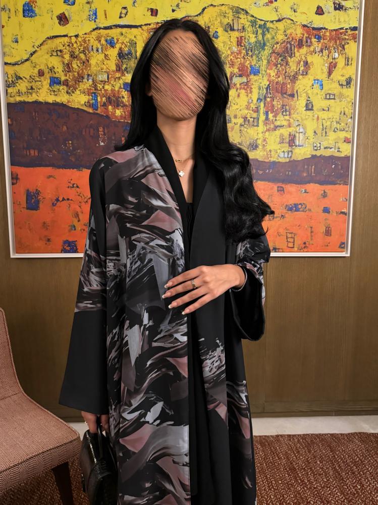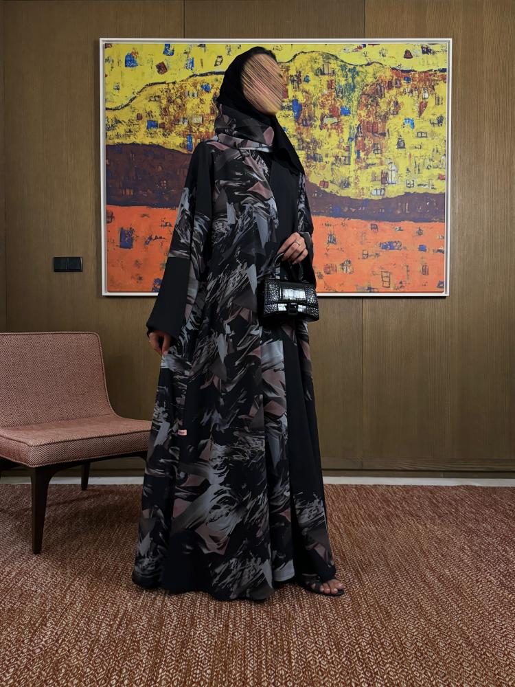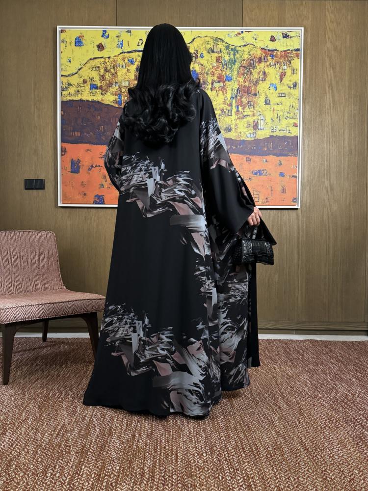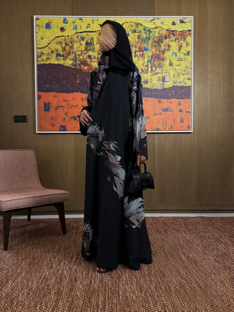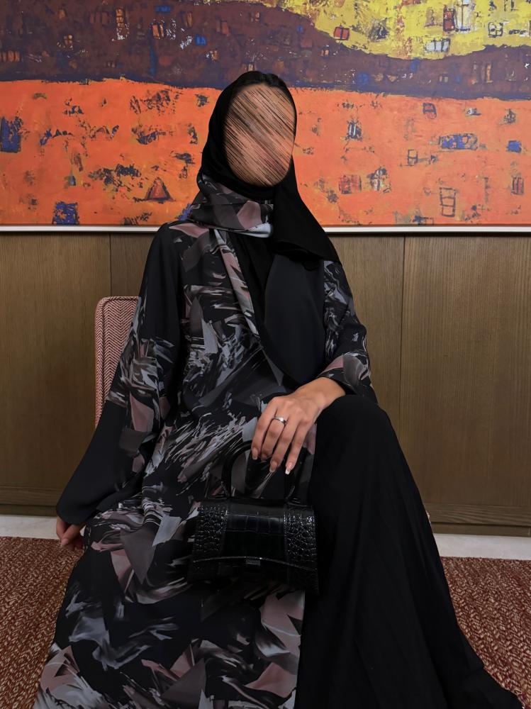 Black chiffon lined half-cloche abaya with a half black chiffon and half chiffon patterned shawl