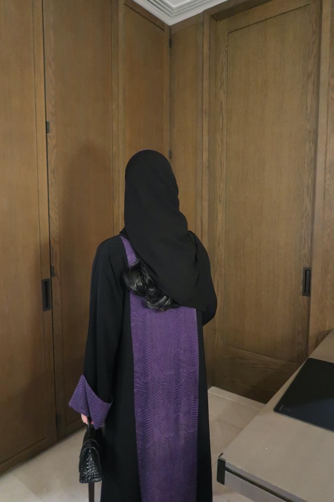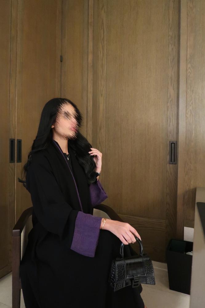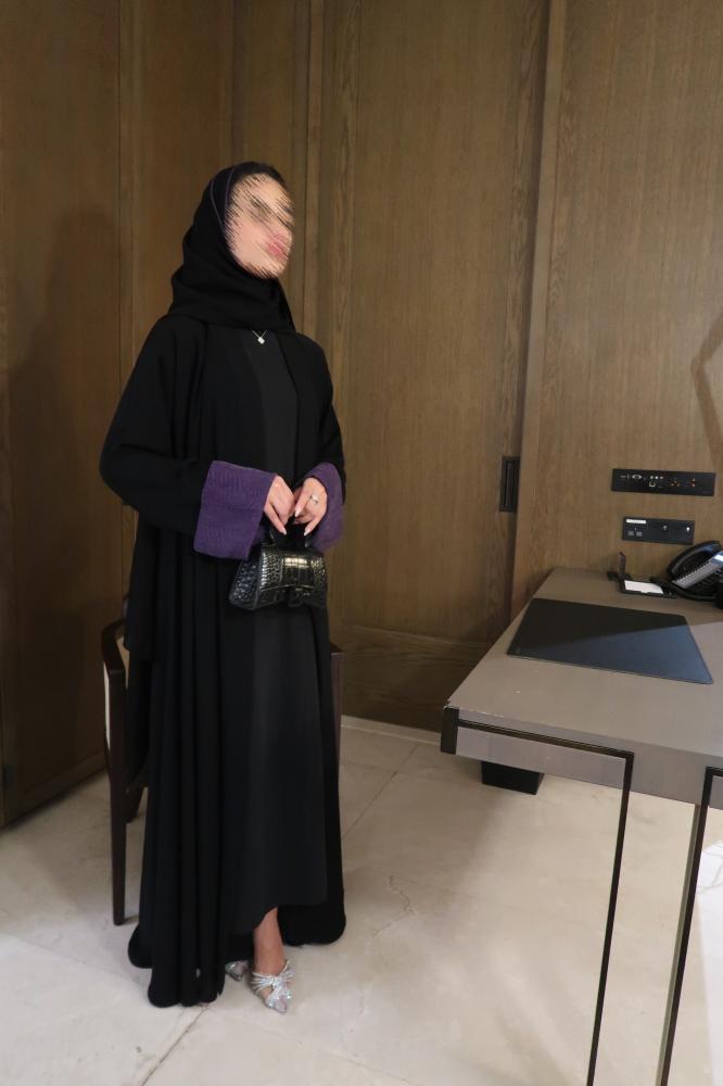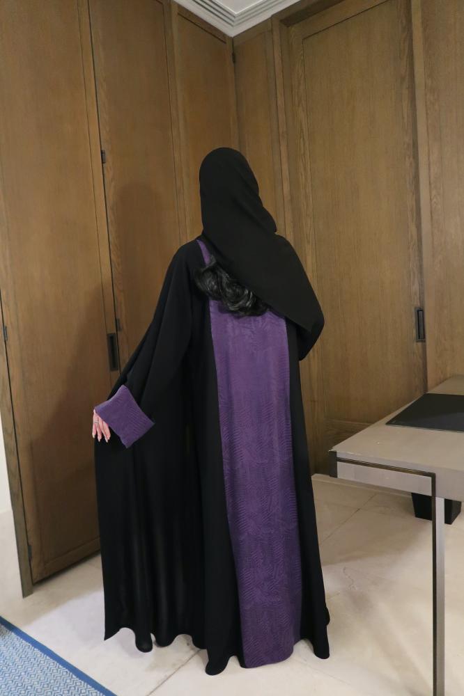 - Light and flowing black Korean crepe fabric abaya with purple washed silk, semi-cloche cut (cold dry clean only)