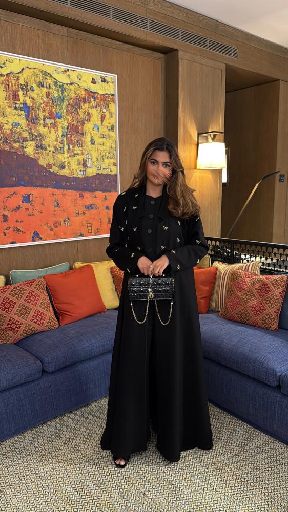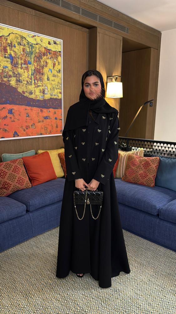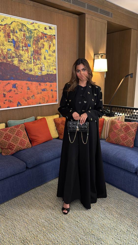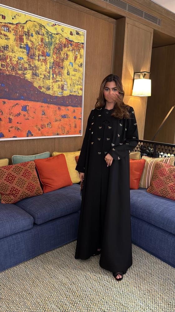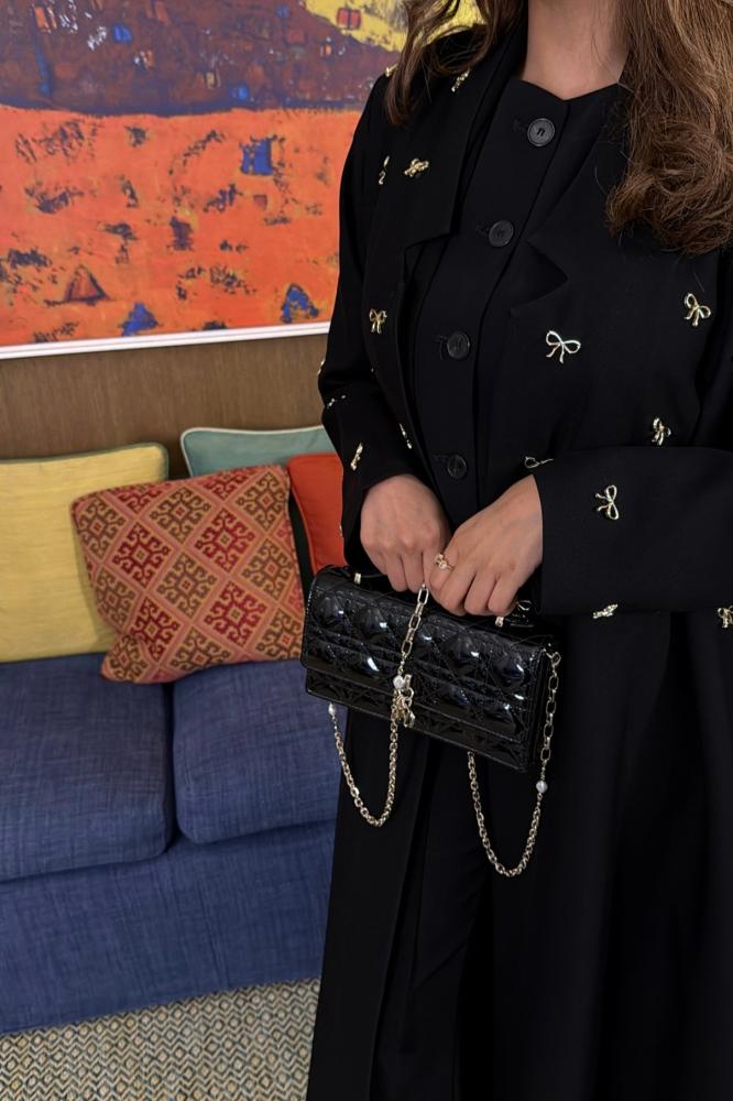 Black linen crepe abaya, half-flare, with bows inserted (metal)