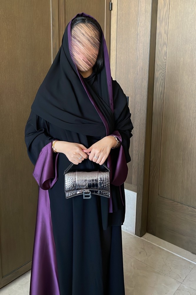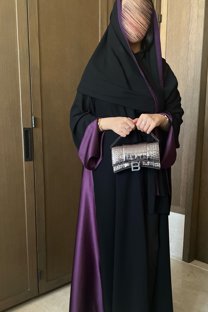- Dark purple crepe abaya with satin crepe and purple edged shawl Implementation period from 7 to 14 working days
