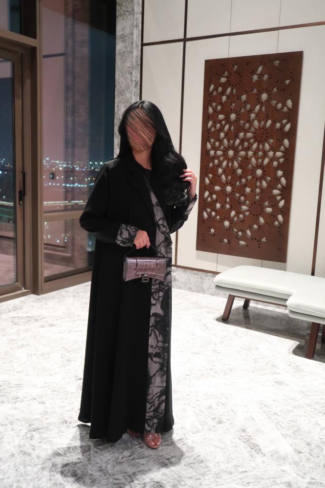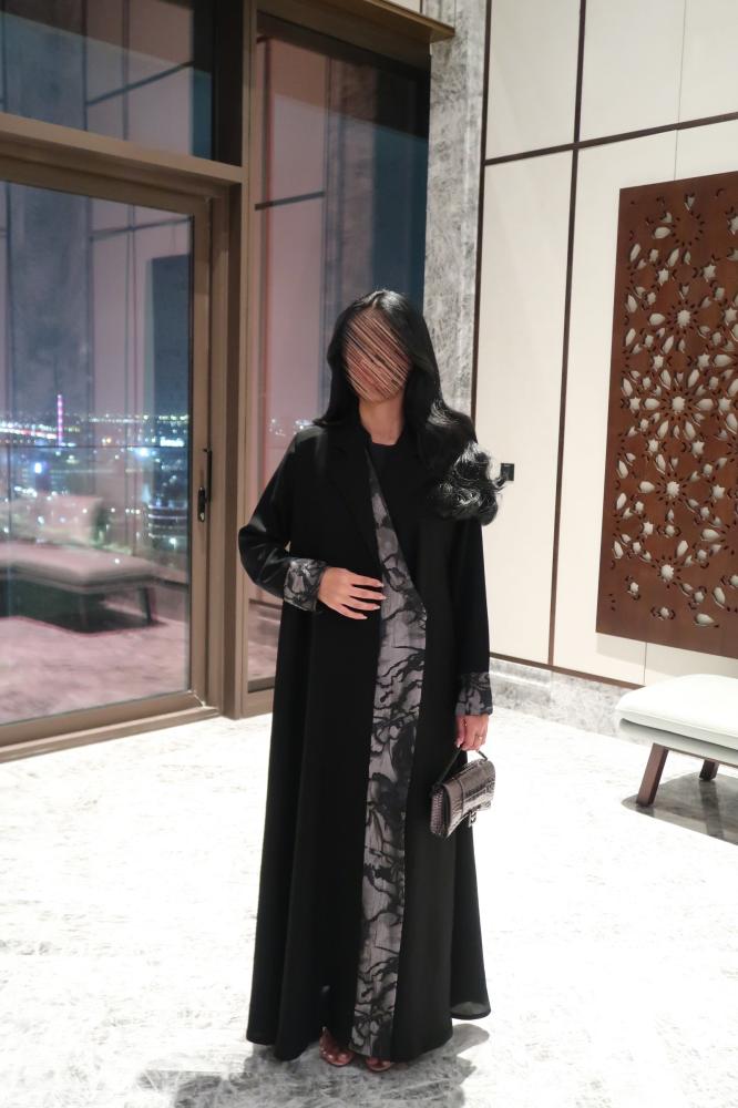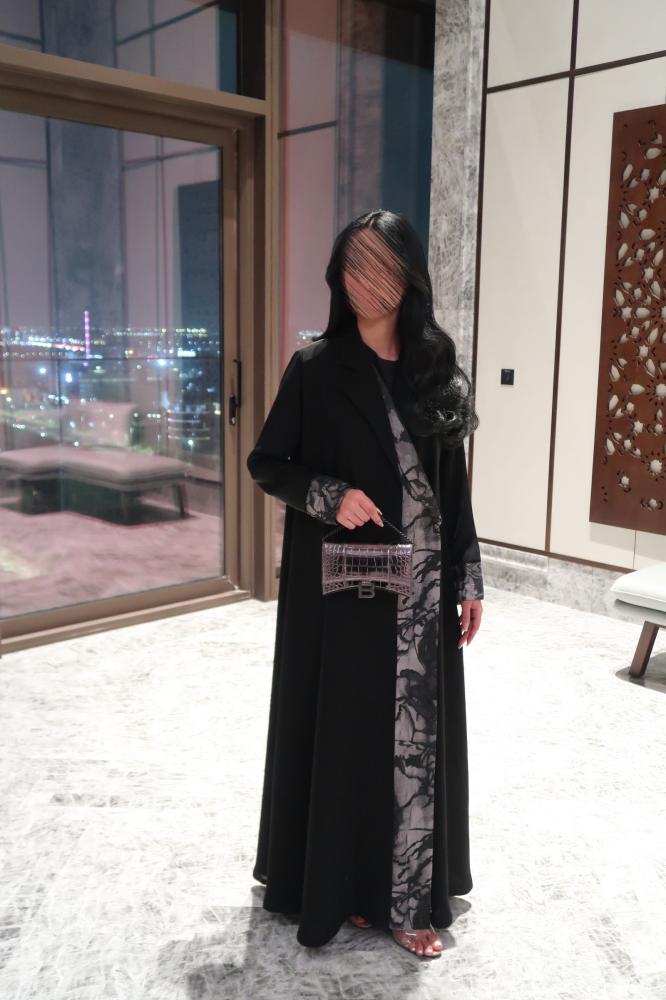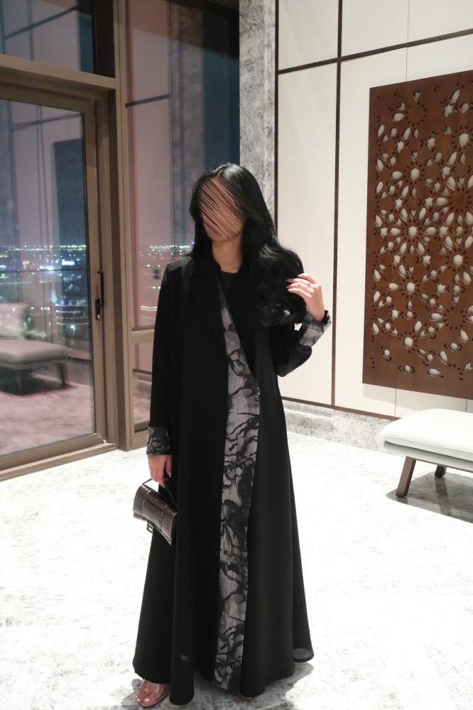 Light, flowing, Korean crepe blazer abaya with half-flared shoulders and a patterned jacquard