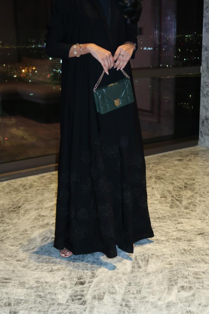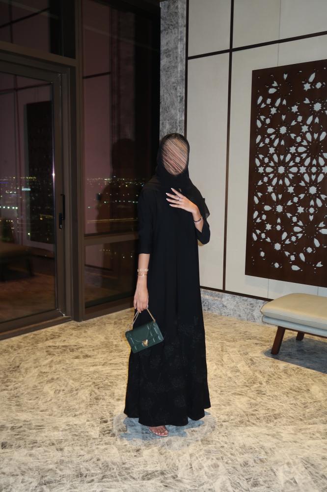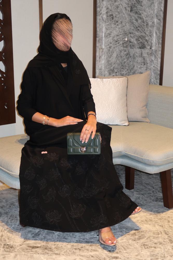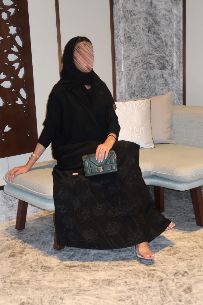 Black Korean crepe blazer abaya with half-cloche shoulders, embroidered with our special embroidery with black cane threads