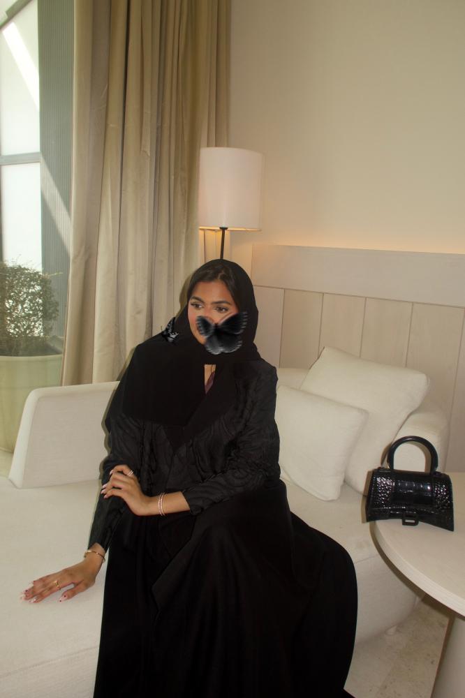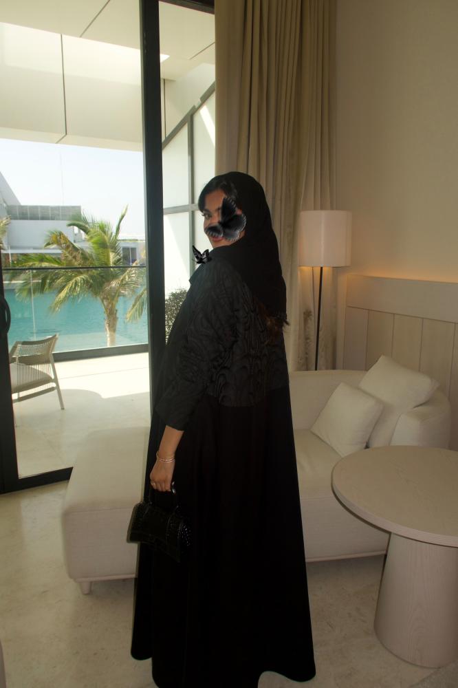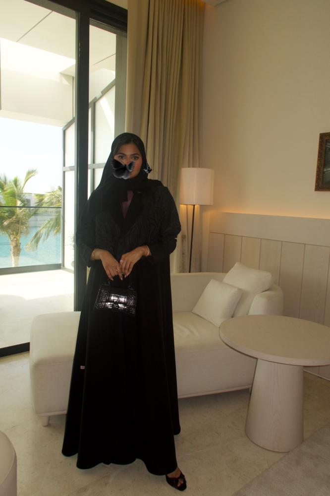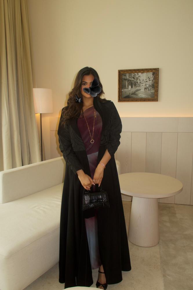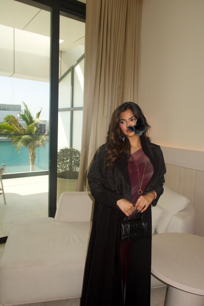 Black linen crepe abaya, half-flare, blazer cut, with shoulder straps and brocade insert