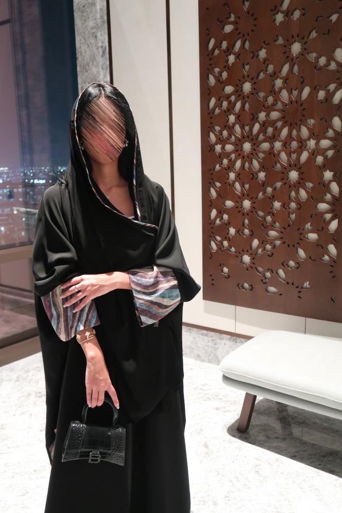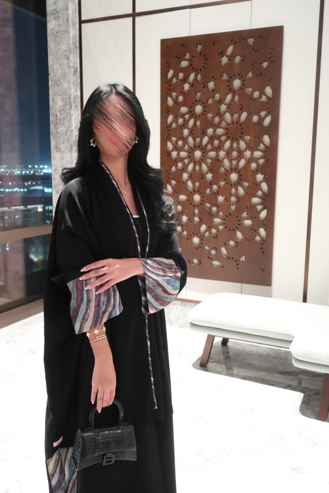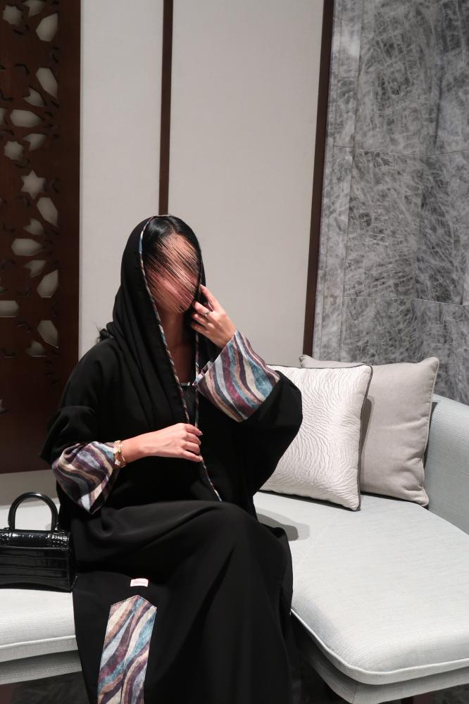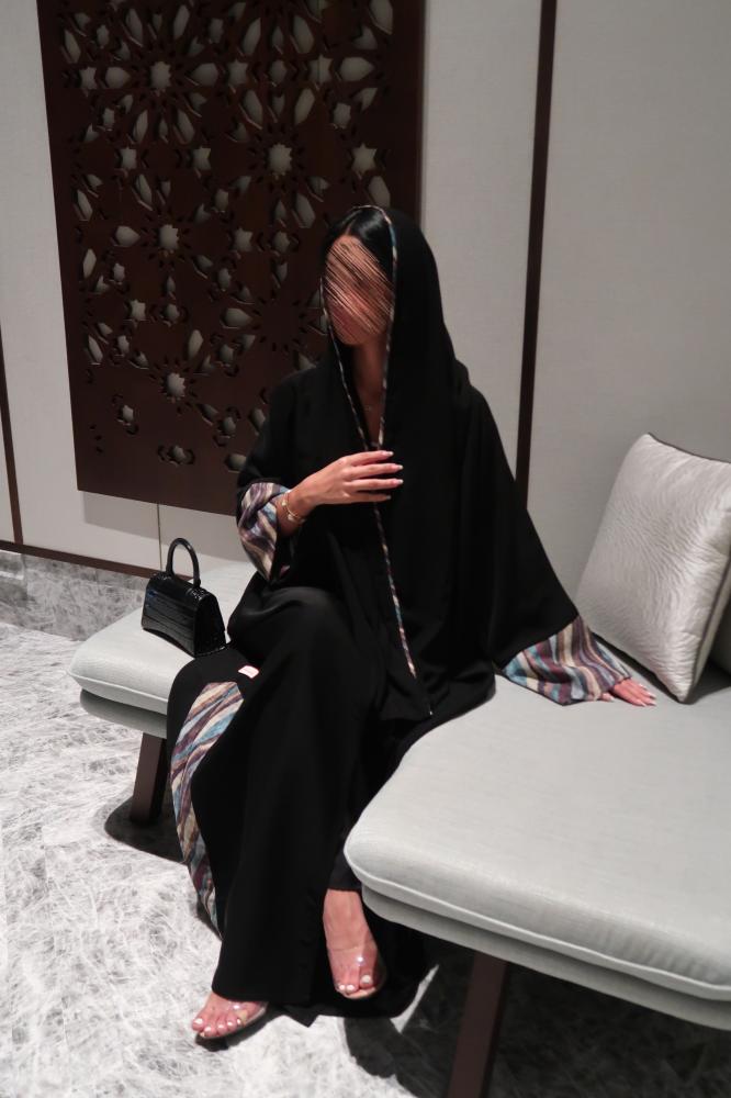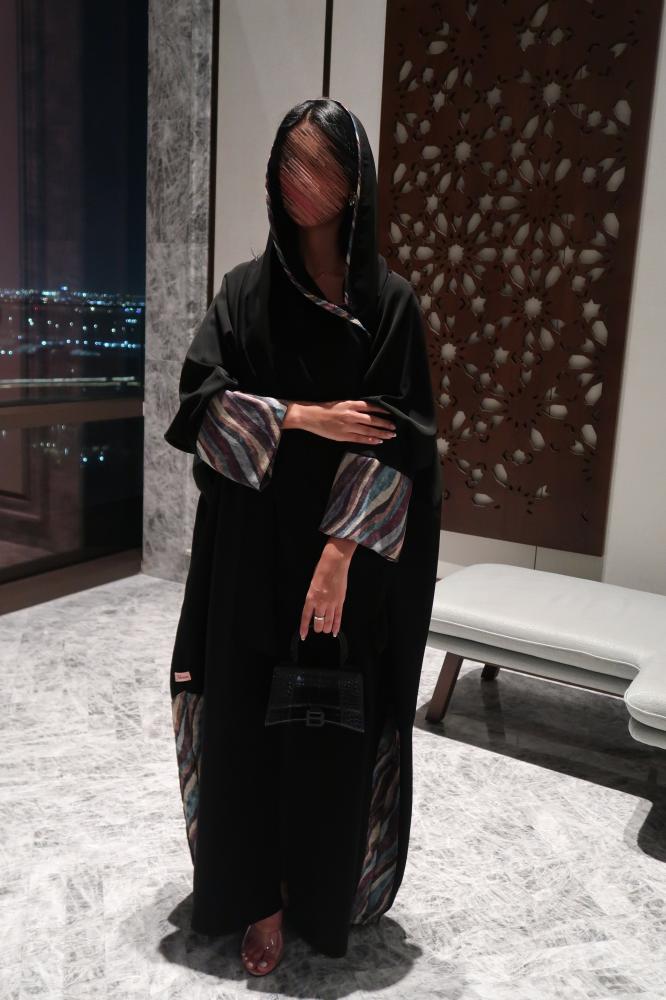 A light, flowing, Korean, black crepe half-bisht abaya with colored linen