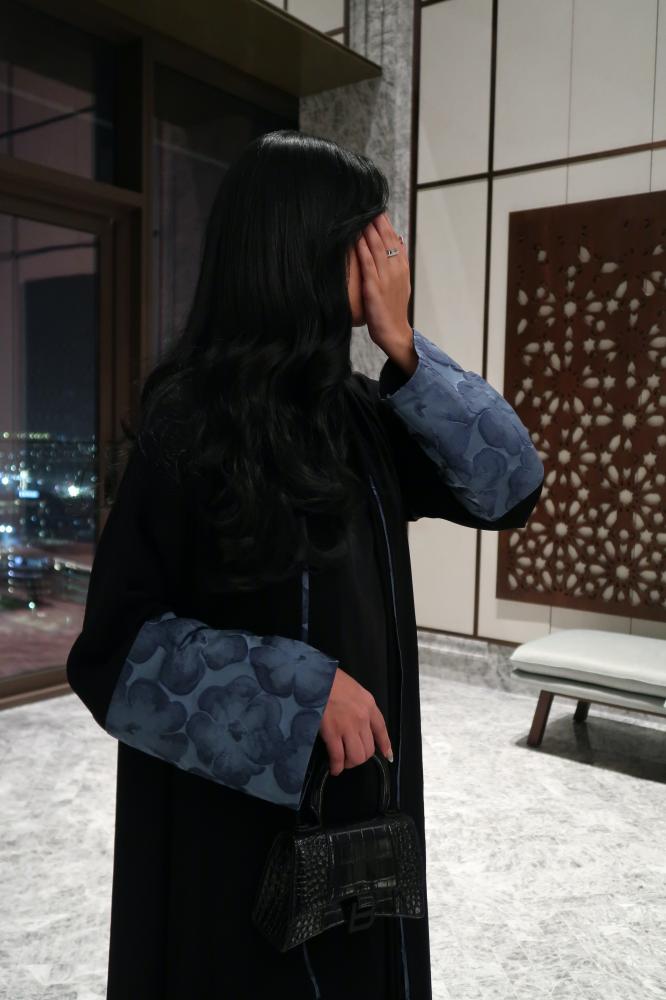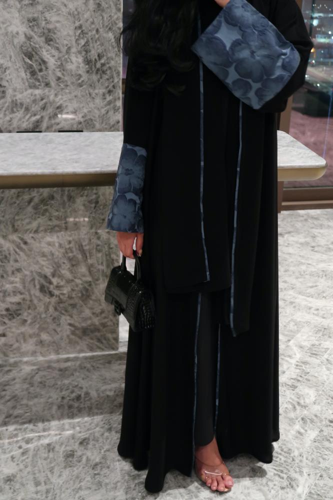 A light, flowing, black Korean crepe half-cloche abaya with Italian patterned taffeta.